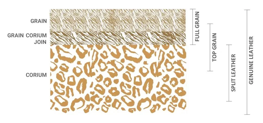 Top Grain Leather is the layer just below the full grain surface but also encompases the layer used to make split grain leather products. It has a different visual look to full grain leather due to having been sanded and treated to remove any full grain blemishes. It is thinner than full grain and more supple and also thinner than split leather so is often used for jackets and other clothing but is unlikely to be used for the production of belts.